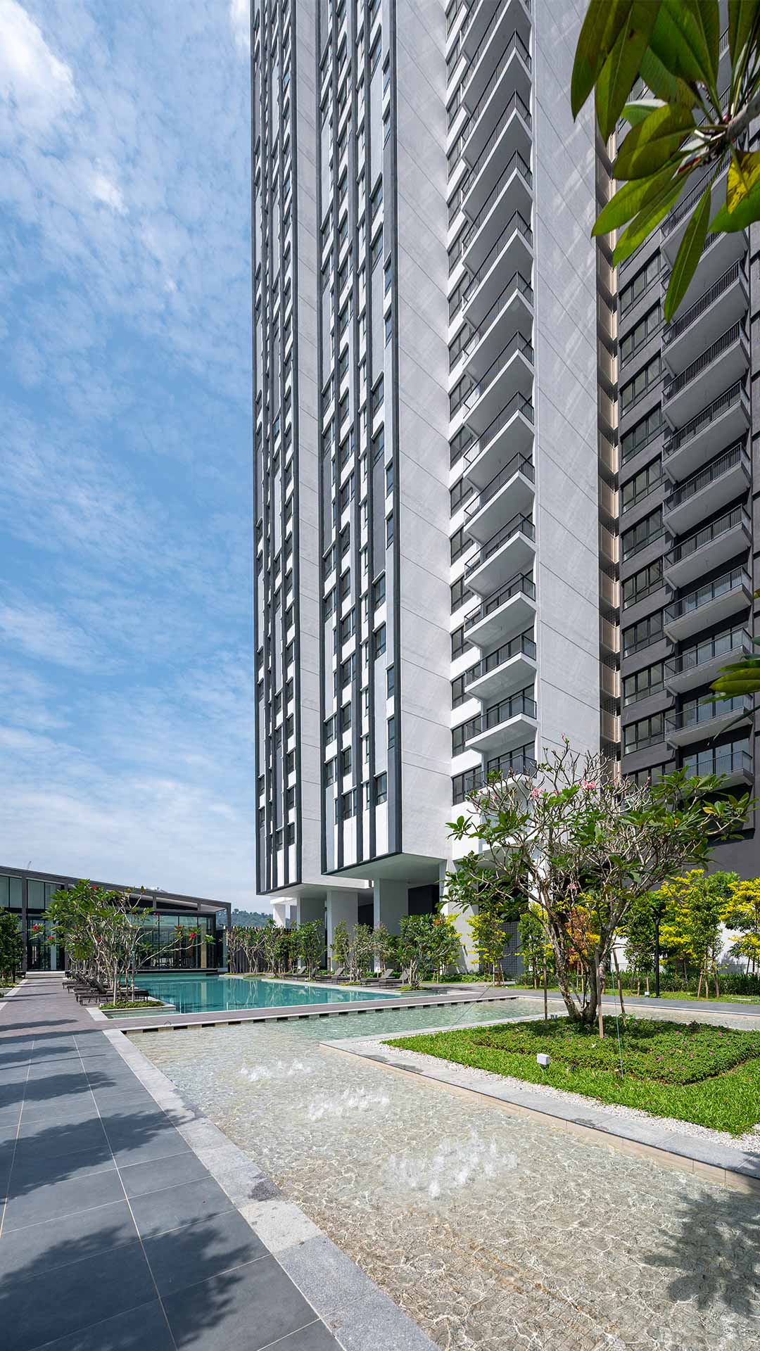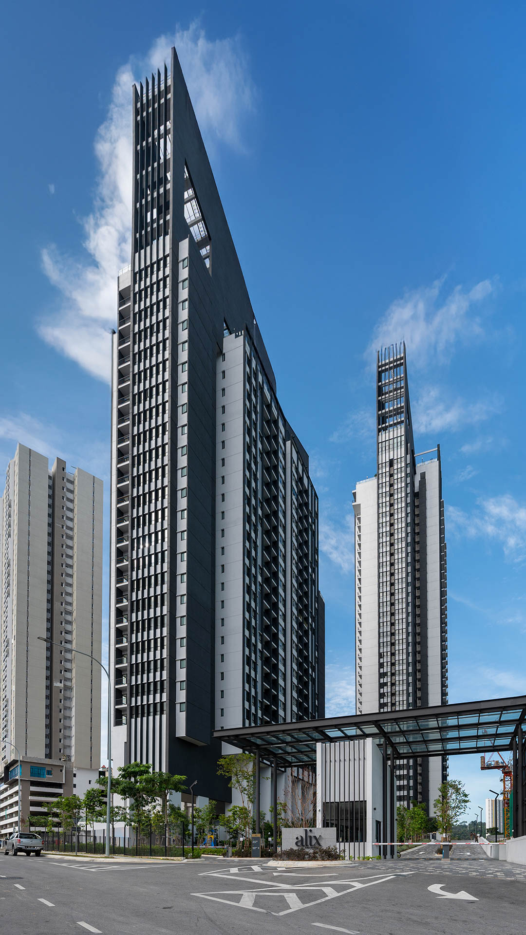 Alix Residences redefines urban living through a visionary approach to the tower-on-podium typology. Two sculpted towers rise from a green meadow, embracing a tripartite composition of base, shaft, and crown. The facade evokes organic growth through vertical fins and expressive fenestration, while the crown blooms gracefully against the city skyline.