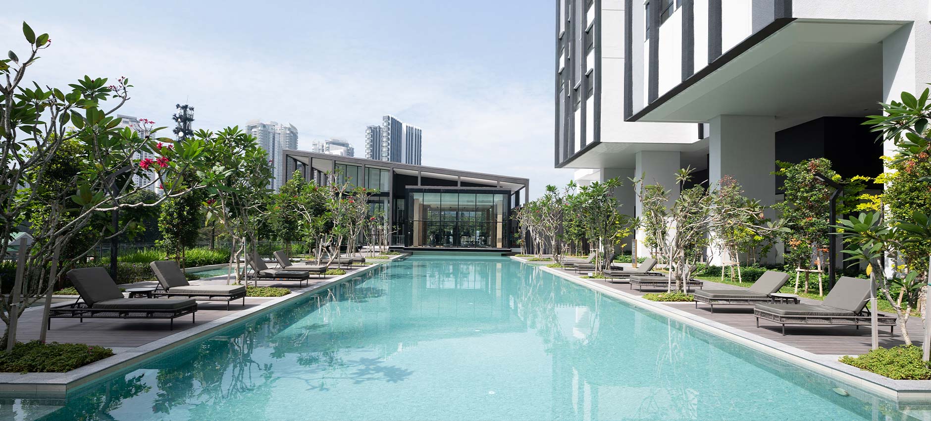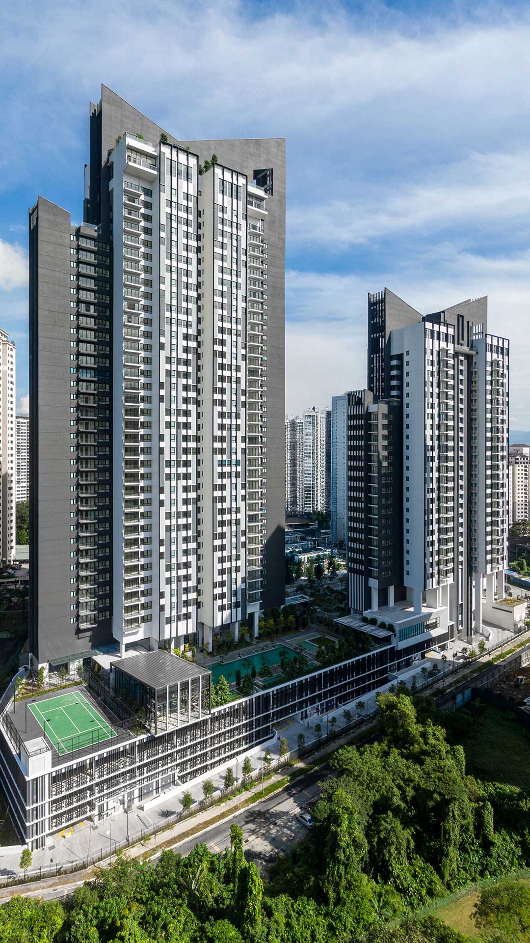 Comprising two towers of 38 and 25 storeys, Alix offers 364 exclusive units ranging from 1,012 to 2,476 square feet. Residents enjoy a collection of best-in-class amenities across podium and rooftop levels, including a Sky Futsal Court, Sky Dining, and a jogging path that encircles the entire site. The towers are uniquely oriented to capture three distinct views – the Titiwangsa Range to the north, Kuala Lumpur City Centre to the east, and Mont Kiara to the south.